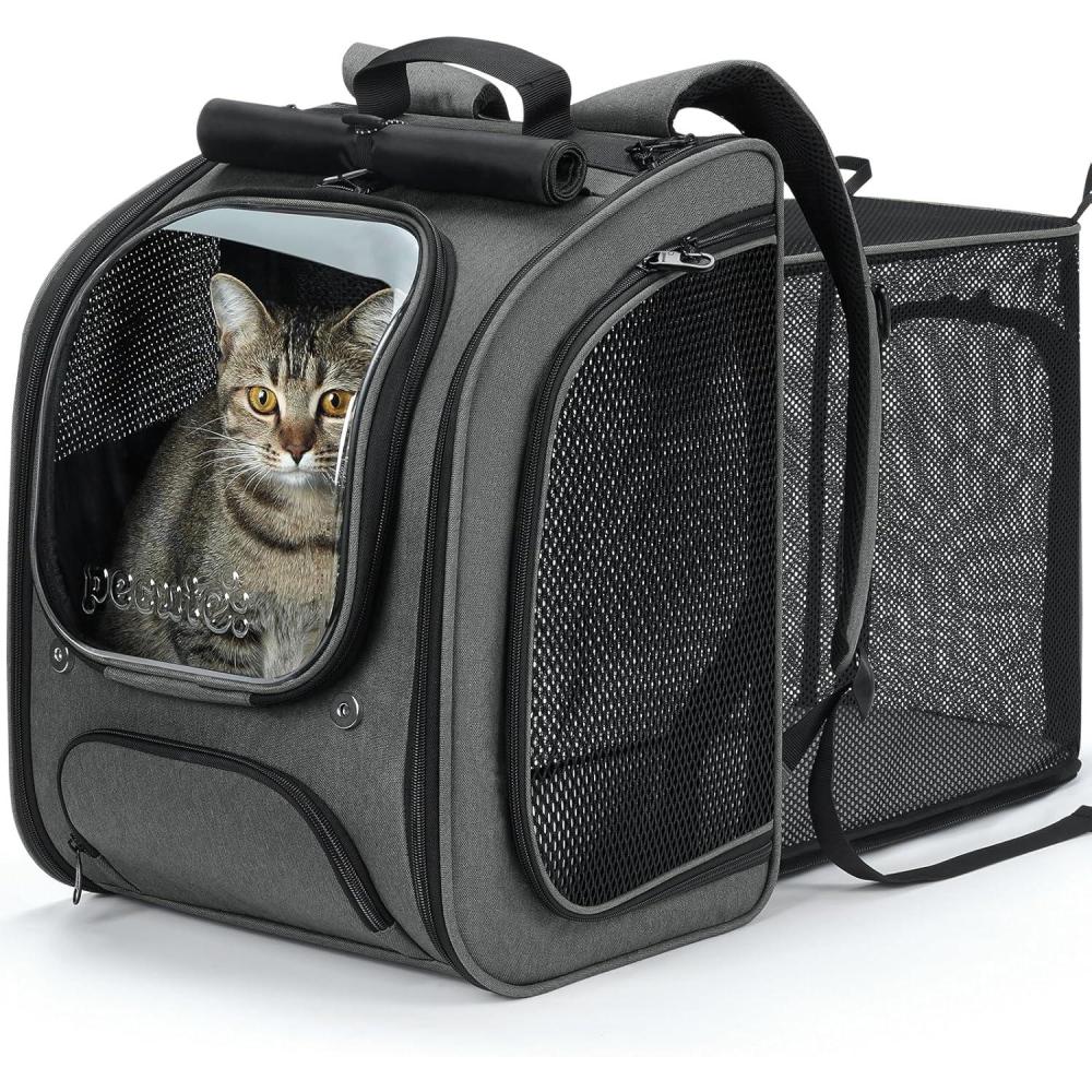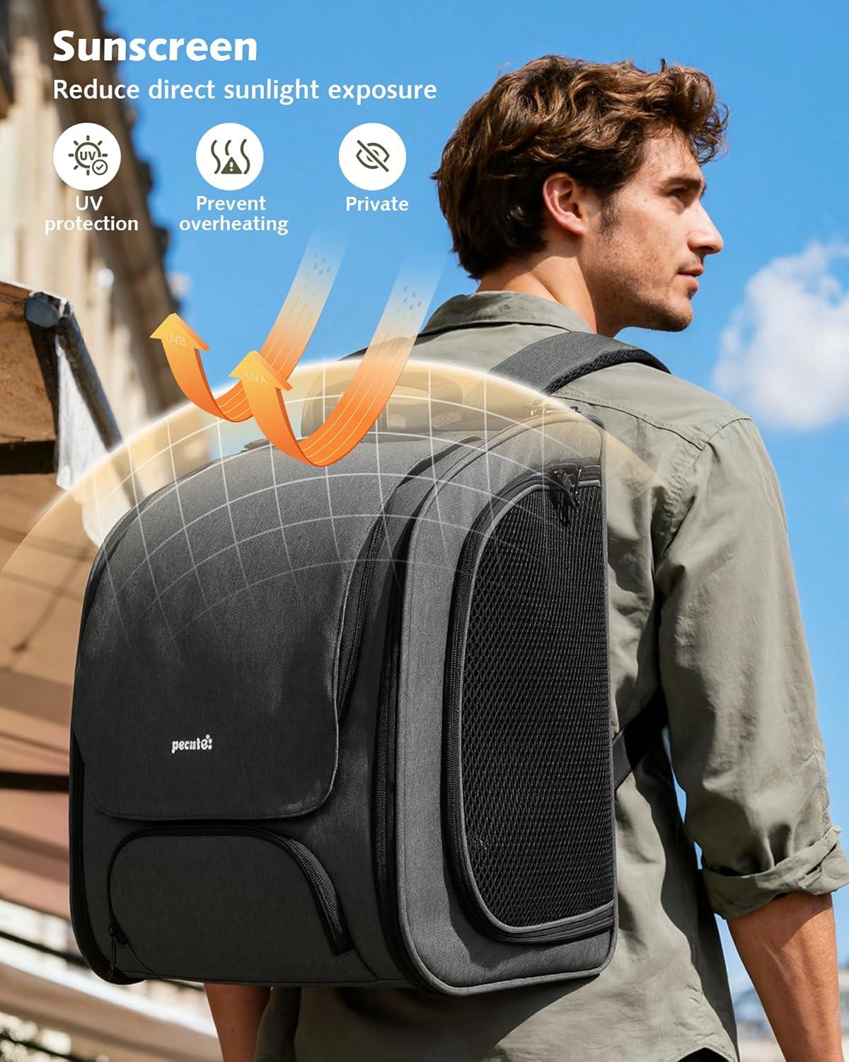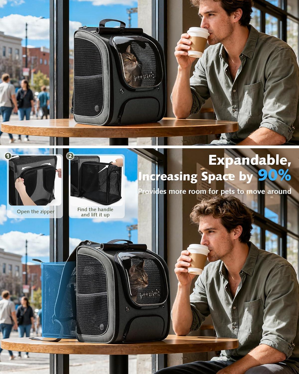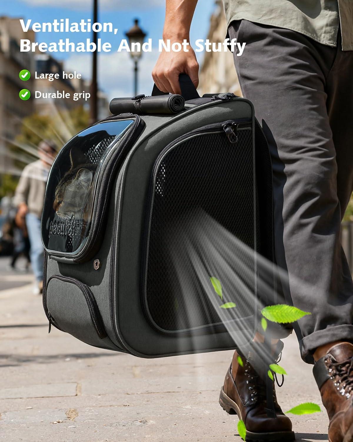 This is a Expandable cat backpack with large space, comfortable carrying experience, waterproof sunshade function, transparent windows with wide field of view, and good breathability.