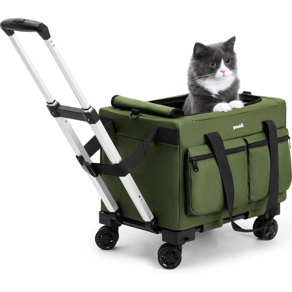 Pecute Cat Carrier with Wheels,Steel Wire Frame Cat Carrier, Stable Pet Trolley for Cats, Pet Handbag and Stroller Bag, Portable Cat Bag for Travel Bus Subway, Green(Dark Grey)