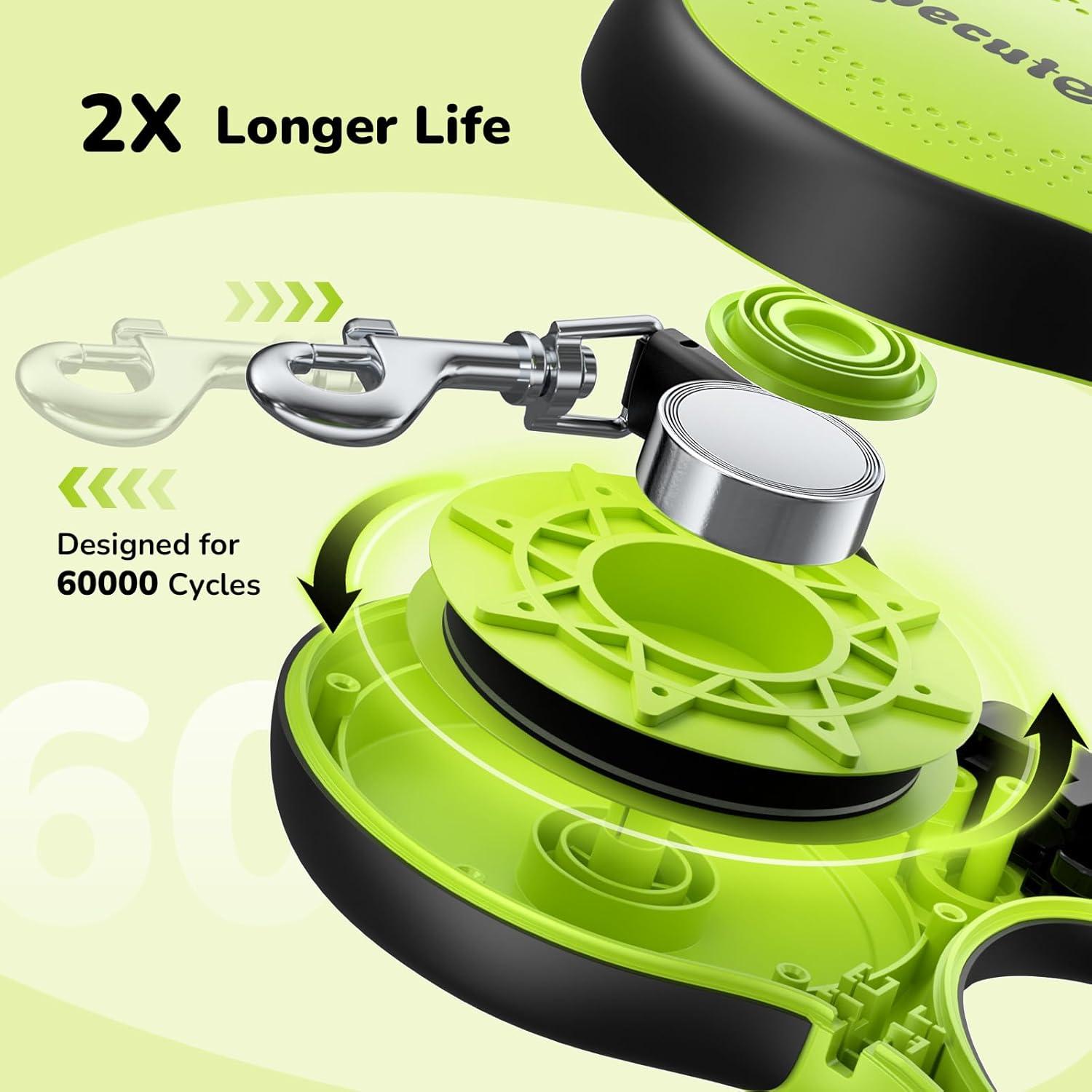 【Upgraded-2X Longer Life】This 2026 upgraded retractable dog leash for large dogs features an 304 stainless steel spring coil, ensuring 60000+ smooth retractions for 2X longer service life, plus a U-shaped guide and 360° rust-proof swivel clip that work together to prevent tangles and twisting from any direction.